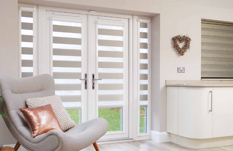 Vision Blinds — also known as Zebra Blinds, Day/Night Blinds, DuoRoll blinds, or the playful “now you see me, now you don’t” — deliver the perfect balance of style and functionality. This innovative double roller blind features alternating fabric stripes that shift effortlessly using a smooth sidewinder chain control. With this clever design, you can maintain your outside view while enjoying privacy and light control exactly when you need it.